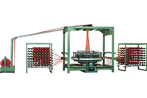 圓織機(jī)的經(jīng)紗架上有許多紗錠,依據(jù)編織布幅寬和扁絲寬度,使用規(guī)定范圍數(shù)量的經(jīng)紗.經(jīng)紗進(jìn)入圓織機(jī)前,由經(jīng)紗的棕框?qū)?jīng)紗進(jìn)行交叉開口,緯紗梭子在交叉開口中作圓周運(yùn)動穿過經(jīng)紗,編織成筒布.